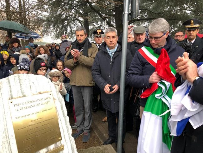 Oggi, 27 gennaio 2019, Giorno dedicato alla memoria della Shoah, giorno in cui ricordiamo il progetto mirante alla distruzione del popolo ebraico, al quale concorse anche la politica persecutoria avviata in Italia dal fascismo, viene ricollocata al suo posto la targa che ricorda Giorgio Perlasca, Giusto tra le Nazioni. Una mano anonima ed un gesto vigliacco l’hanno divelta da questo luogo, pensando così di cancellarne il ricordo. Noi siamo qui, oggi, per riaffermare i valori di civiltà contro una barbarie, che sotto forme diverse, ma con la stessa violenza e circondata dalla stessa indifferenza, sembra voler riemergere dal passato.