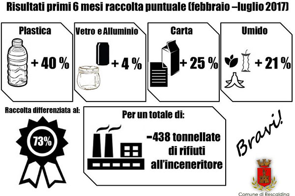Se i numeri si confermeranno così positivi fino alla fine dell’anno, la Tassa Rifiuti del 2018 potrà diminuire per tutti i rescaldinesi virtuosi. E, soprattutto, ogni rescaldinese avrà contribuito a diminuire le risorse naturali necessarie a produrre nuovi oggetti e a ridurre l’inquinamento dell’aria derivante dall’incenerimento dei rifiuti indifferenziati, che avviene vicino a noi a Busto Arsizio.