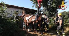 Un cavallo è caduto all’interno di una buca posta in una proprietà privata. I vigili del fuoco intervenuti con un’autopompa,