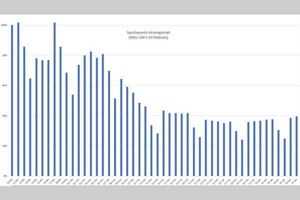 Lo ha detto il vicepresidente di Regione Lombardia Fabrizio Sala illustrando l’analisi degli ultimi dati rilevati dai cambi di celle telefoniche alle quali si agganciano gli smartphone dei cittadini che si spostano.